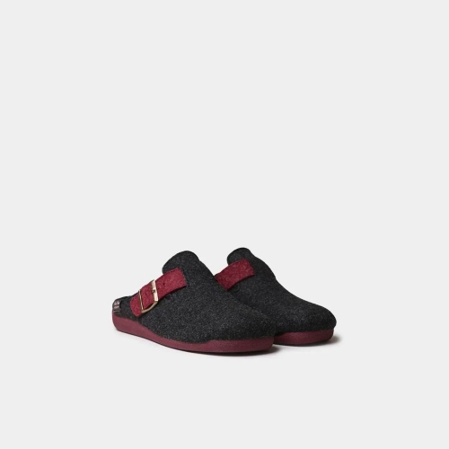 Esta zapatilla de casa tipo zueco para hombre está confeccionada en fieltro reciclado. Cuanta con una hebilla regulable para poder ajustar esta slipper. Un modelo muy cómodo que te acompañará todo el invierno. La suela, la plantilla y la tira ajustable están hechas en un color contrastado. La suela es de goma antideslizante y tiene 3 cm de grosor.