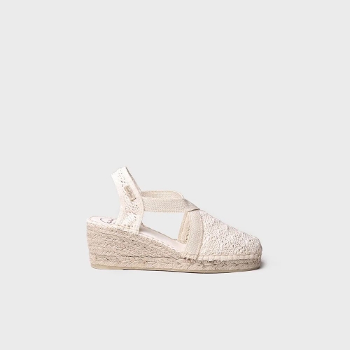 Esta alpargata de mujer está elaborada en tejido de algodón tipo ganchillo. La cuña de yute tiene una altura total de 6 cm, de los cuales 4 cm forman parte del tacón y 2 cm de la plataforma. La base de la suela es de goma antideslizante. La plantilla interior está forrada en tejido. Cuenta con dos bandas elásticas para una perfecta fijación al pie. Este diseño está cosido a mano en España. Es un modelo vegano.