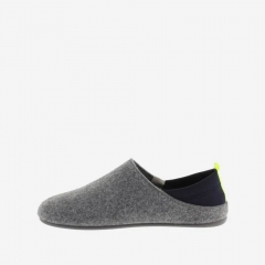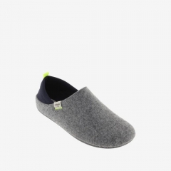 Zapatillas de casa marino para hombre. Fabricadas en España. Combinan fieltro reciclado, trasera de neopreno y tirador en contraste. Se pueden llevar calzadas o en modo destalonado gracias a la trasera de neopreno.