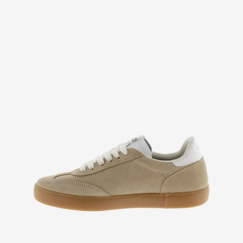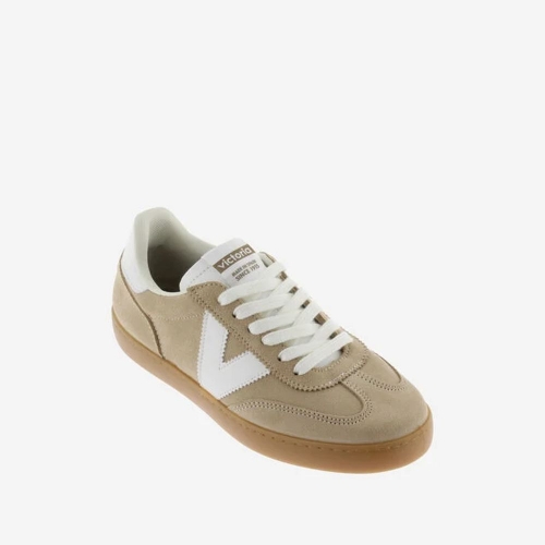 Zapatillas unisex fabricadas en España en serraje de colores. V de victoria lateral y pieza trasera en blanco en contraste. Cierre mediante cordones también blancos y costuras a contraste. Suela de T.R. traslúcido color caramelo.
