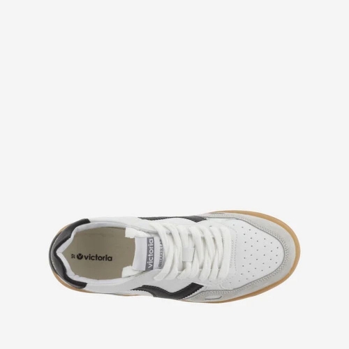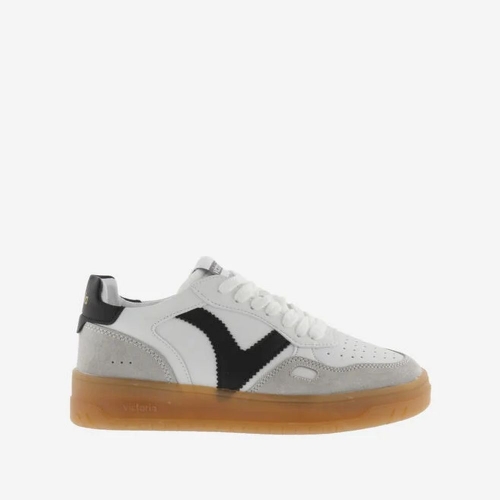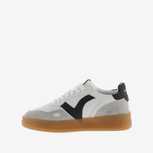Zapatillas deportivas unisex fabricadas en material efecto piel y piezas de serraje. V del lateral en colores negro y blanco, a juego con la pieza trasera con el logotipo de la marca. Cierre mediante cordones al tono. Detalle en forma de ventana en el lateral. Suela en color caramelo de 3,5 cm. Incluyen una plantilla extraíble acolchada para mayor confort.