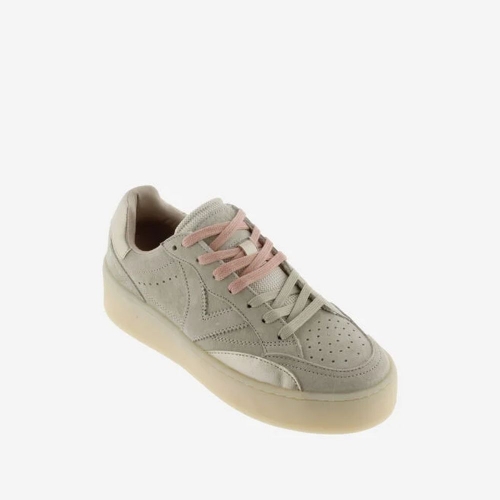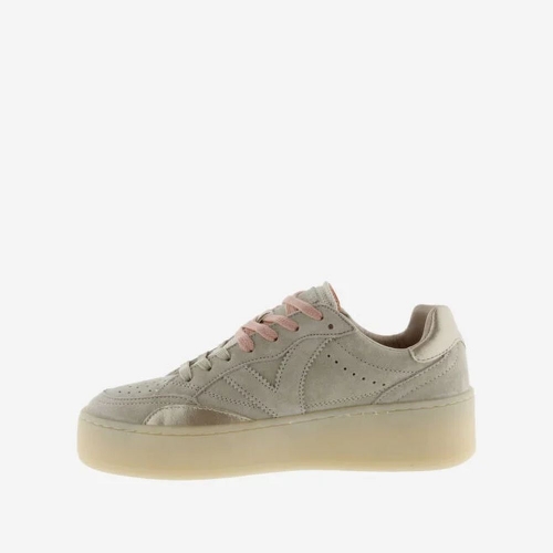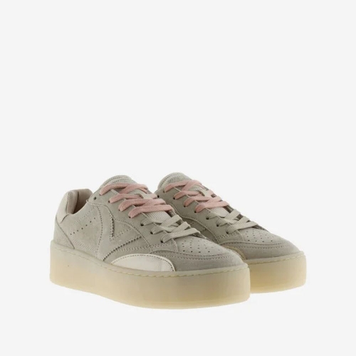 Zapatillas con plataforma para mujer fabricadas en serraje con piezas metalizadas al tono. Cierre mediante cordones bicolor: unos al tono y otros en color rosa. Puntera perforada para favorecer la transpiración. Suela de TPR traslúcido color caramelo.
