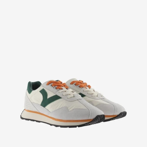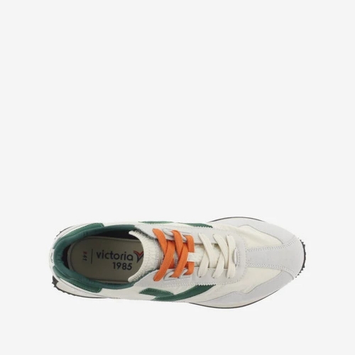 Sneakers unisex fabricadas en nylon con piezas superpuestas de piel. V retro de victoria lateral y pieza trasera en colores a juego, también con el forro interior. Cierre mediante doble cordón: unos al tono y otros coloridos. Suela de EVA bicolor con patín dentado de goma. Incluyen además una plantilla ergonómica que se adapta a la forma del pie y regala la sensación de comodidad.